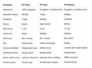 Namun tidak semua PP itu sama. Terdapat tiga varian utama: PP Homopolymer, PP Copolymer (Impact Copo), dan PP Random Copolymer, masing-masing dengan karakteristik teknis, aplikasi, dan respon terhadap panas serta bahan kimia yang berbeda.